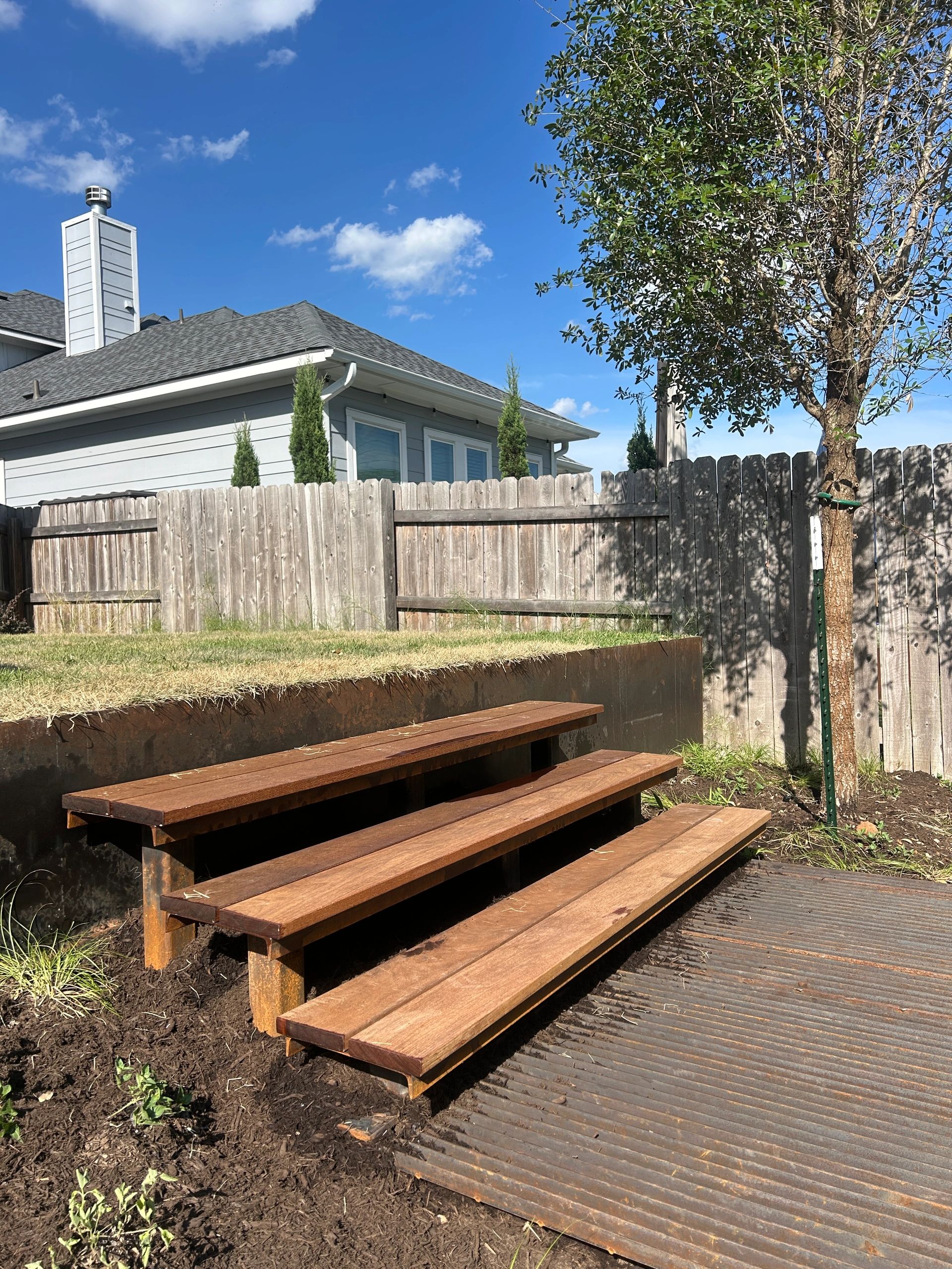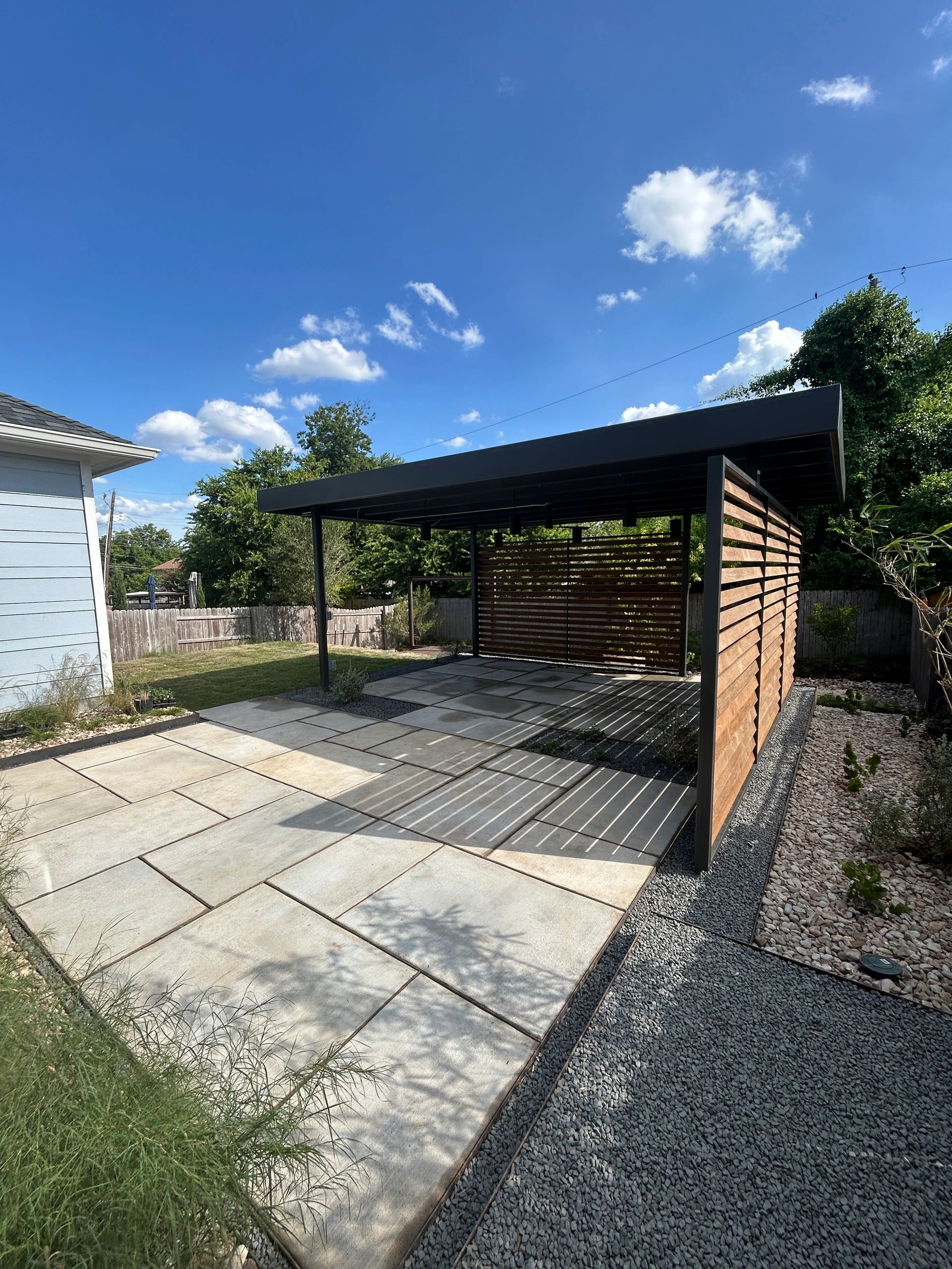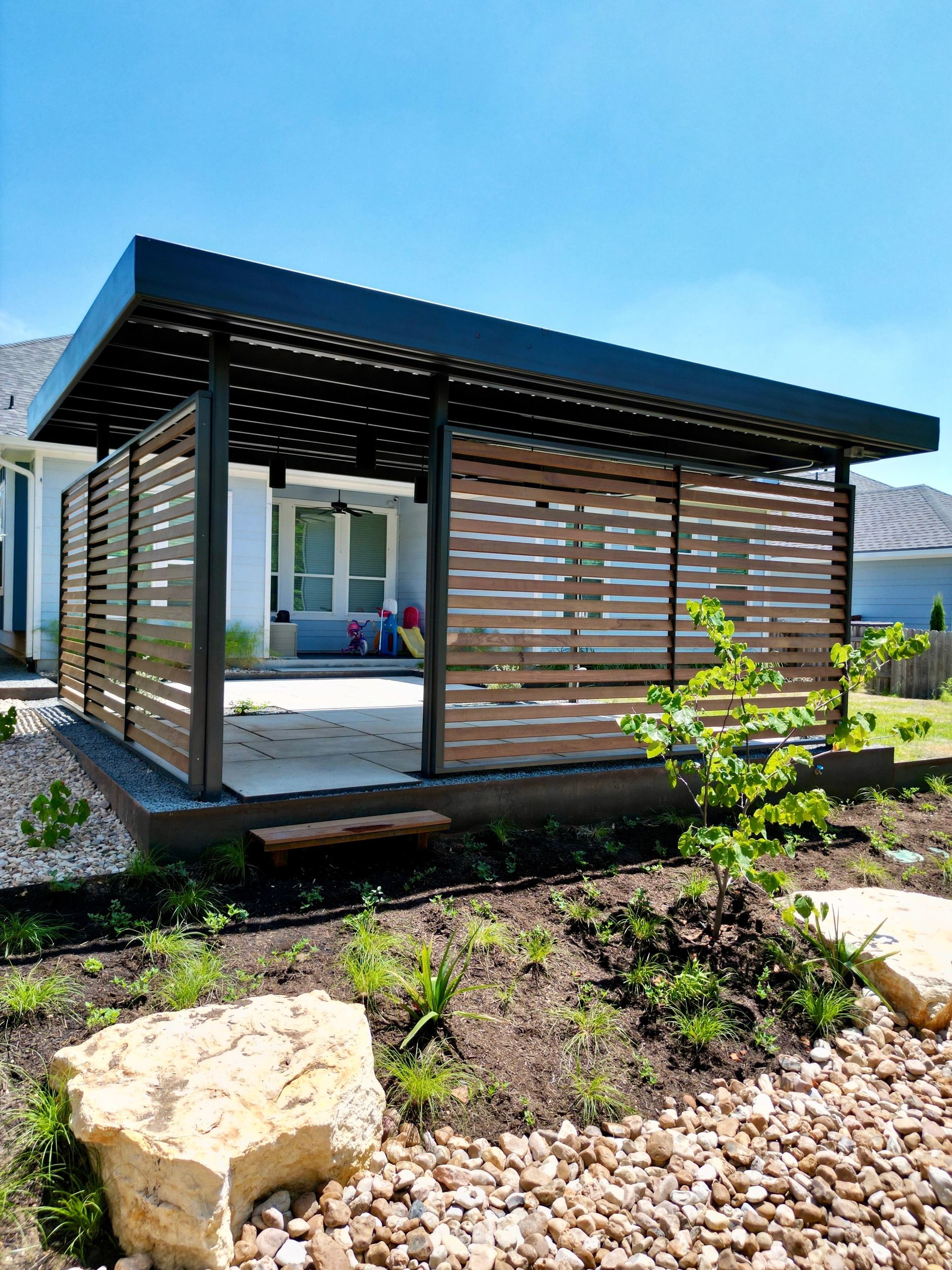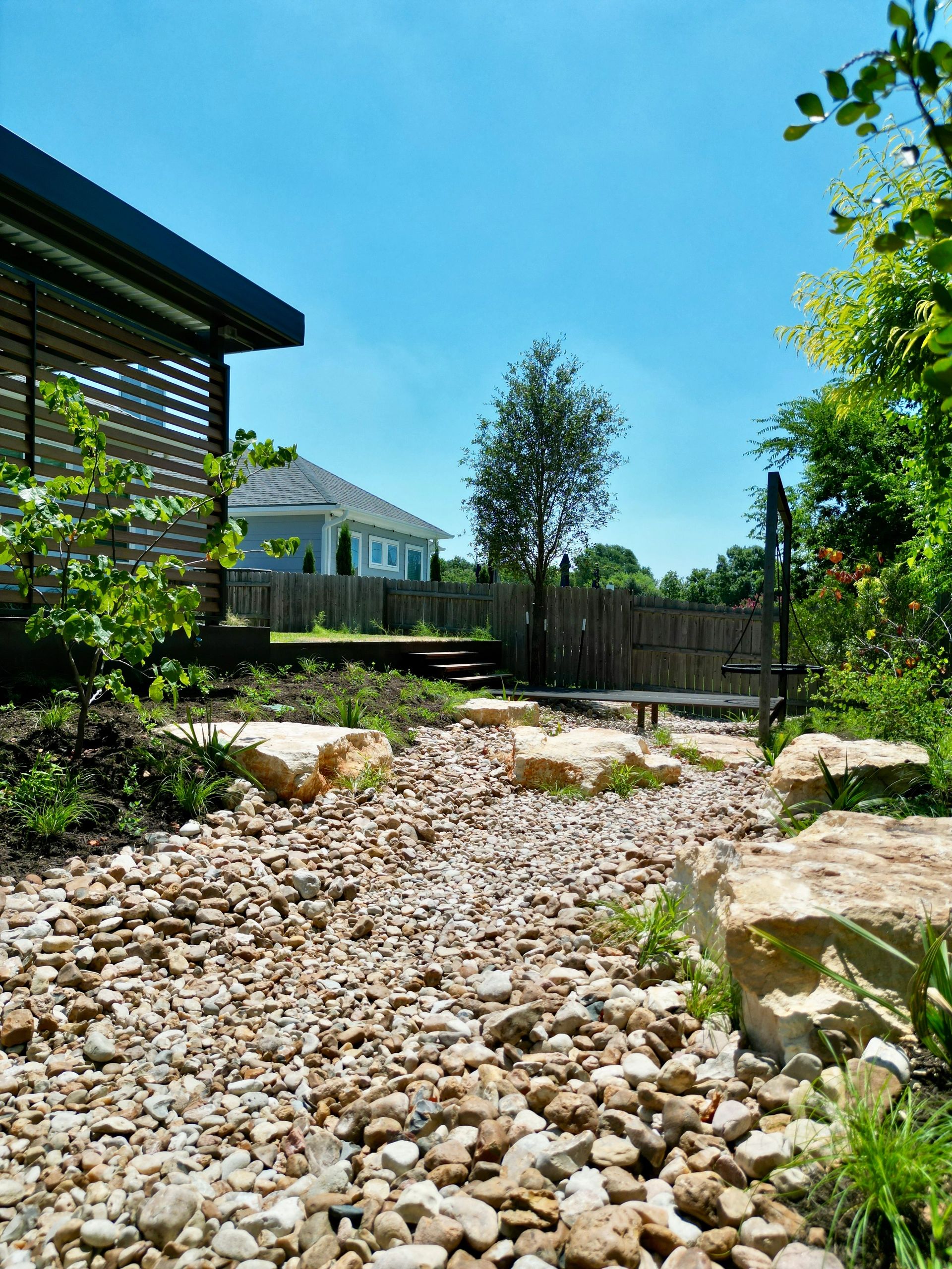 Our North Austin project consisted of a complete backyard build. The centerpiece of this transformation includes two elegant structures that add both functionality and aesthetic appeal. A dry creek, lined with massive boulders, meanders through the landscape, providing a natural and serene ambiance. The steel-edged patterned concrete patio offers a modern touch, seamlessly integrating with the surroundings. To complete the look, we planted a magnificent 100-gallon live oak, adding a touch of timeless beauty and shade to this impressive outdoor space. Though the space may be a challenge, the possibilities are endless, showcasing how thoughtful design can maximize any area. This project exemplifies our commitment to quality, creativity, and harmony with nature.